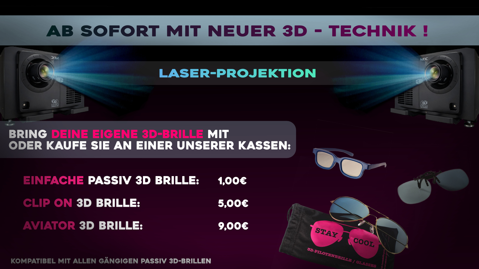 Bei uns können Sie auch bargeldlos (EC, Geldkarte, Maestro, MasterCard, Visa) oder in Franken bezahlen. Wechselkurse an der Kinokasse.